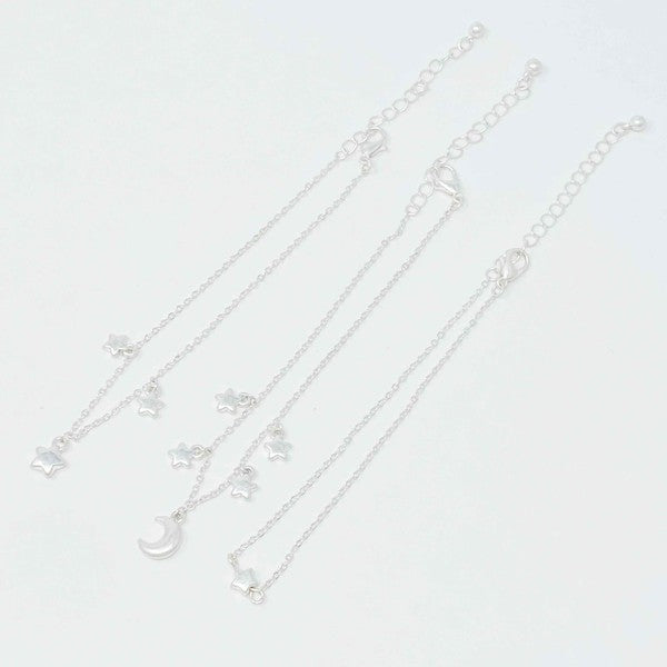 This trendy anklet set has 3 individual anklets with small star charms that make perfect layers. Each anklet is pretty and has great details to wear it alone.